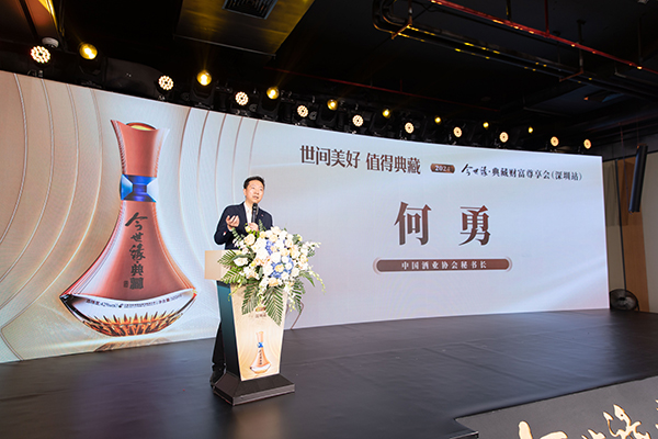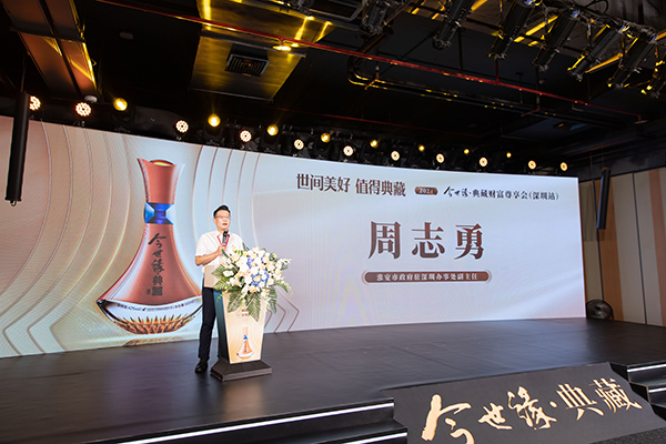 淮安市政府駐深圳辦事處副主任周志勇發表致辭。他說,江蘇淮安文化底蘊深厚,今世緣酒業作為淮安的杰出代表,此次在深圳舉辦今世緣·典藏財富尊享會暨新品上市發布會,不僅體現了對深圳市場的重視,也彰顯了淮安與深圳之間日益密切的交流與合作。