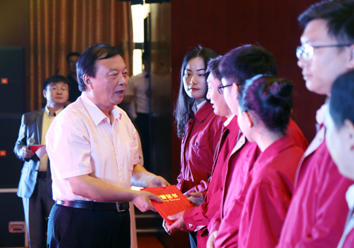 今世緣酒業(yè)黨委書(shū)記、董事長(zhǎng)、總經(jīng)理周素明為獲獎(jiǎng)人員頒獎(jiǎng)。