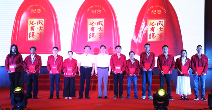 今世緣酒業(yè)黨委書(shū)記、董事長(zhǎng)、總經(jīng)理周素明,副總經(jīng)理、董事會(huì)秘書(shū)王衛(wèi)東與獲獎(jiǎng)人員合影。