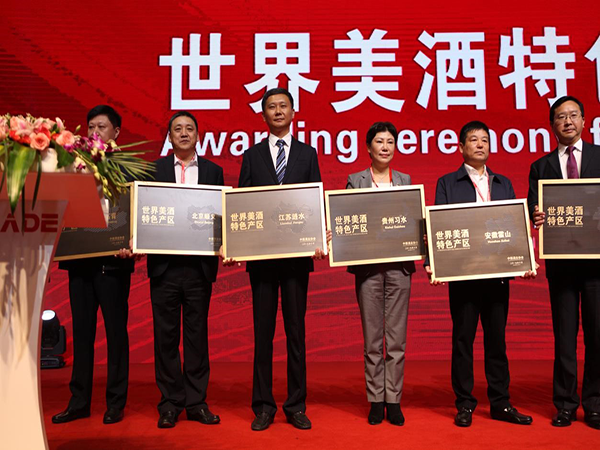 ↑漣水縣委副書記、縣長時勇(左三)代表漣水領取“世界美酒特色產區”榮譽牌。