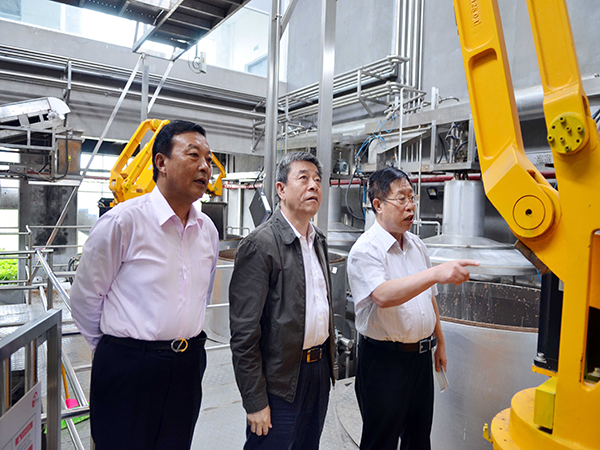 ↑今世緣酒業黨委書記、董事長、總經理周素明(左)陪同中國酒業協會理事長王延才(中)察看今世緣“中國白酒智能化釀酒示范車間”。
