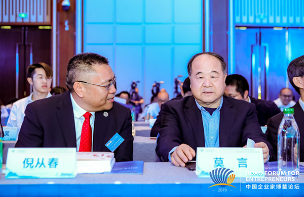 諾貝爾文學獎獲得者、著名作家莫言,今世緣酒業黨委副書記、副總經理倪從春在2019中國企業家博鰲論壇平行論壇“文化經濟發展論壇:文化經濟與高質量發展”上