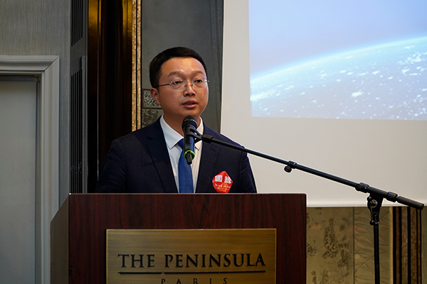 江蘇今世緣酒業股份有限公司副總經理胡躍吾在巴黎半島酒店向法國經貿界及法國酒業專家分享今世緣緣文化和“國緣V9”。