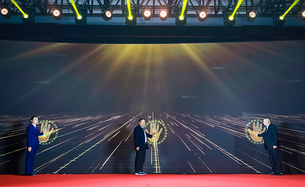 江蘇省慈善總會副秘書長謝玉和(中)、江蘇省廣播電視總臺綜藝頻道總監席文宏(右)、今世緣酒業副總經理胡躍吾(左)共同啟動“聚荔2020”結緣儀式。