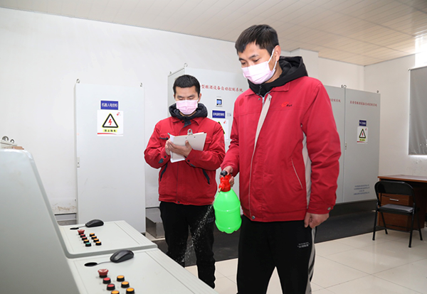 今世緣酒業智能化釀酒車間員工在為設備控制室消毒。