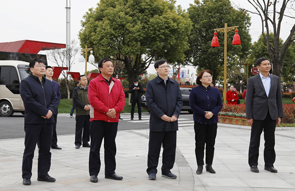 市長陳之常(中)在今世緣企業文化廣場了解今世緣企業文化建設情況。