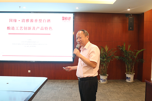 今世緣酒業副董事長、副總經理吳建峰介紹清雅醬香型白酒釀造工藝創新及產品特色。