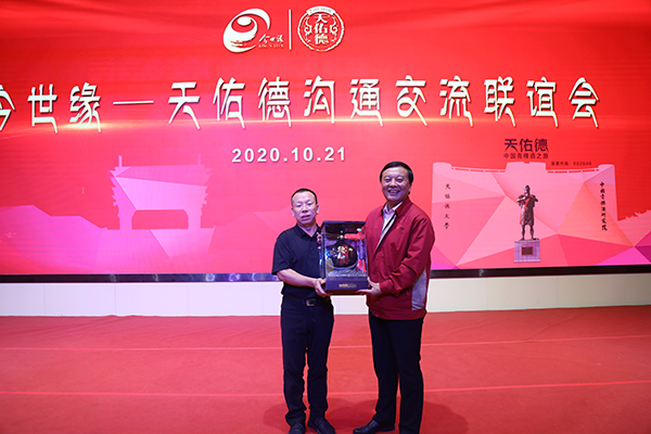 聯誼會上,周素明與李銀會互贈美酒,共敘美好緣分,共話美好未來。