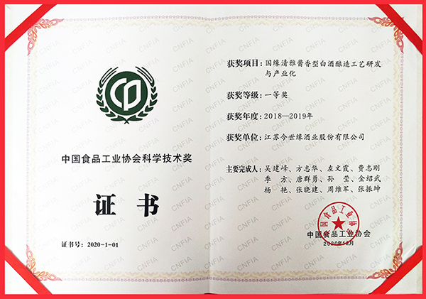 12月6日,2020中國食品工業(yè)協(xié)會科學技術獎勵大會在河南鄭州舉行,大會由中國食品工業(yè)協(xié)會主辦,每兩年評審、授獎一次。“國緣清雅醬香型白酒釀造工藝研發(fā)與產業(yè)化”項目獲得2020中國食品工業(yè)協(xié)會科學技術獎一等獎,今世緣酒業(yè)副董事長、副總經理吳建峰榮獲“全國食品工業(yè)科技創(chuàng)新領軍人物”稱號。