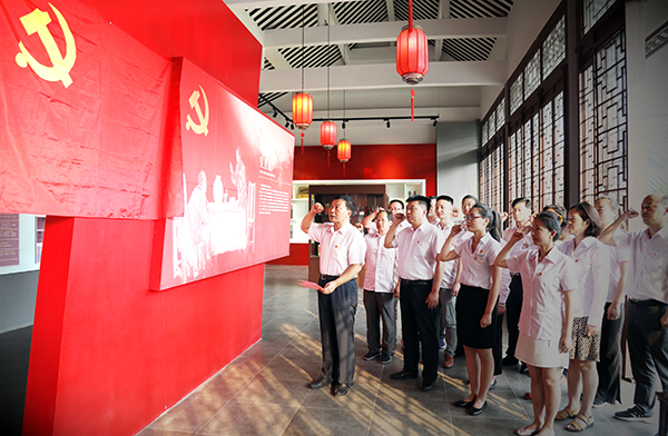 在高溝酒非遺保護(hù)區(qū)“紅色高溝”陳列室,今世緣酒業(yè)黨委書記、董事長周素明帶領(lǐng)黨群黨支部黨員重溫入黨誓詞。