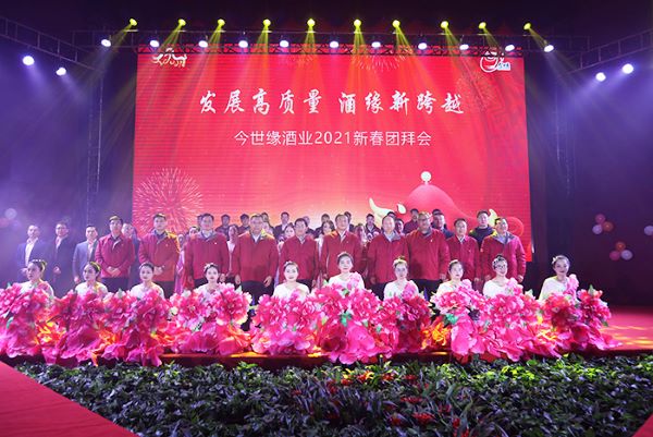團(tuán)拜會上,公司員工表演了精彩的文藝節(jié)目。團(tuán)拜會在歌伴舞《春到福來》中熱鬧開場,生產(chǎn)黨總支表演了相聲《匠心醬酒》,質(zhì)量管理部、研究院表演了情景舞蹈《酒鄉(xiāng)情緣》和音樂舞臺短劇《前行的使命》,包裝中心表演了音詩畫《緣力奮進(jìn)跨越發(fā)展》。情景劇《我們這五年》講述了今世緣“十三五”發(fā)生的翻天覆地的變化。音樂小品《昨天 今天 明天》帶著大家回憶過去、展望未來。歌曲《幸福之旅》展示了新世紀(jì)以來,以周素明為首的領(lǐng)導(dǎo)班子帶領(lǐng)今世緣人劈波斬浪,披荊斬棘,釀造幸福的奮斗之旅。歌伴舞《醉美今世緣》帶著大家領(lǐng)略了今世緣廠區(qū)的美麗景色。情景表演《披星戴月趕路人》表現(xiàn)銷售團(tuán)隊全力打贏國緣V系攻堅戰(zhàn)、國緣K系提升戰(zhàn)、今世緣典藏激活戰(zhàn)、省外市場突破戰(zhàn)“四大戰(zhàn)役”的堅定決心。小品《“緣”地過年》講述了公司為留守本地過年的外省員工以及留在前方市場過年的員工做好服務(wù)保障,以暖心之舉為防疫大局添磚加瓦。團(tuán)拜會在歌伴舞《花開新時代》的音樂聲中圓滿結(jié)束。