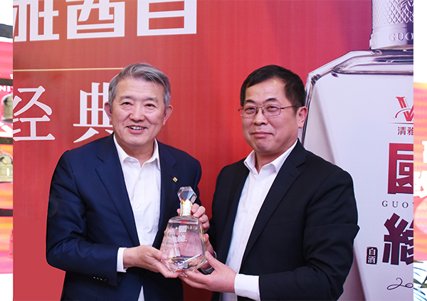 今世緣酒業黨委副書記、副董事長、總經理顧祥悅(右)向武漢大學杰出校友、泰康保險集團董事長陳東升(左)贈送國緣V9定制酒。