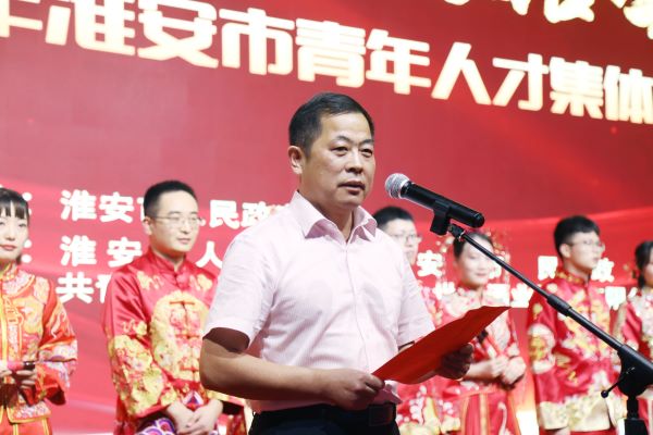 2021淮安市第二屆青年人才集體婚禮由淮安市人民政府主辦,市人才辦、市民政局、團市委、今世緣酒業共同承辦。淮安市民政局黨組書記沈在宏為新人頒發紀念婚書。淮安市委組織部副部長、老干部局局長、市人才辦主任姜洪洋,共青團淮安市委書記何喆共同為新人頒發愛情信物。