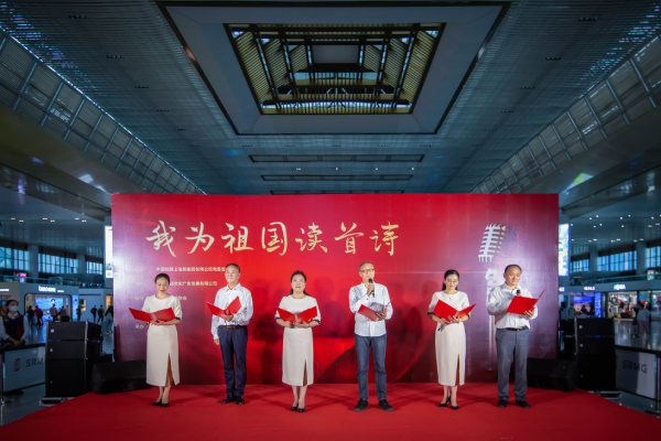 活動現場,國旗揮舞成紅色的海洋。深沉、激情、高昂的朗誦,讓形色匆匆的旅客緩緩停下腳步,座位席上的旅客也紛紛放下手機,循聲張望。