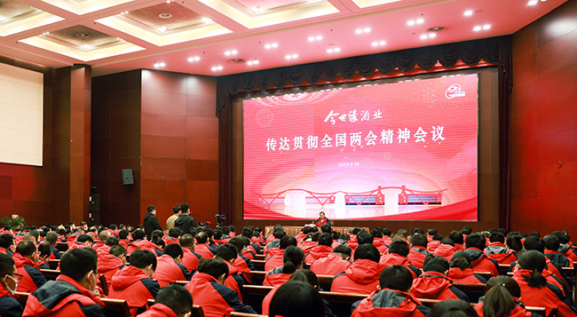 “強國建設、民族復興的宏偉目標令人鼓舞,催人奮進。我們要牢記習總書記的囑托,牢牢把握高質量發展這個首要任務,感恩奮進,跨越趕超,誓奪營收百億目標?!比珖舜蟠?,今世緣酒業黨委書記、董事長、總經理顧祥悅向全體員工傳達貫徹全國兩會精神如是說。