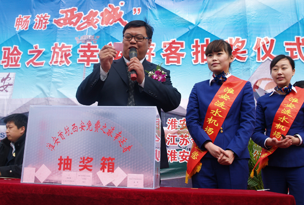 3月20日上午,“喜結今世緣暢游西安城”淮安—西安首航免費雙飛體驗之旅幸運游客抽獎儀式在市區大運河文化廣場舉行。副市長史國君、市旅游局局長吉文海、淮安漣水機場總經理張慶明、公司副總經理羊棟等出席抽獎儀式。