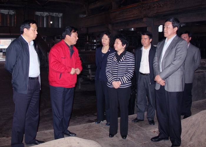 廠區道路寬廣,綠化帶四面環繞,一排排整齊的廠房相映在綠樹叢中……走進廠區大門,黃莉新感慨地說:“我曾于2009年和2011年來過今世緣,與那時相比,現在的今世緣面積更大,環境更優美,設施更先進,令人耳目一新。”在機械化釀酒車間,黃莉新來到高效運行的自動化釀造設備前仔細查看。周素明介紹說,機械化釀造系統是今世緣自主研發、行業首創,走在了茅臺、五糧液的前面,已申報多項國家專利。作為公司“兩化融合”的代表性成果,機械化釀造系統不久前還得到了工信部領導和行業專家的肯定,黃莉新聽后連連點頭表示贊許。隨后,黃莉新來到窖池前,聽取白酒釀造流程的介紹,并饒有興致地詢問窖池的發酵原理、發酵時間等。在勾儲中心地下酒庫,了解到公司貯存原酒的陶壇均產自宜興,黃莉新笑著說:“今世緣與無錫、宜興都有緣,希望今后的合作范圍更廣。”她勉勵公司進一步改革創新、做大做強,為漣水乃至淮安經濟社會發展作出更大的貢獻。